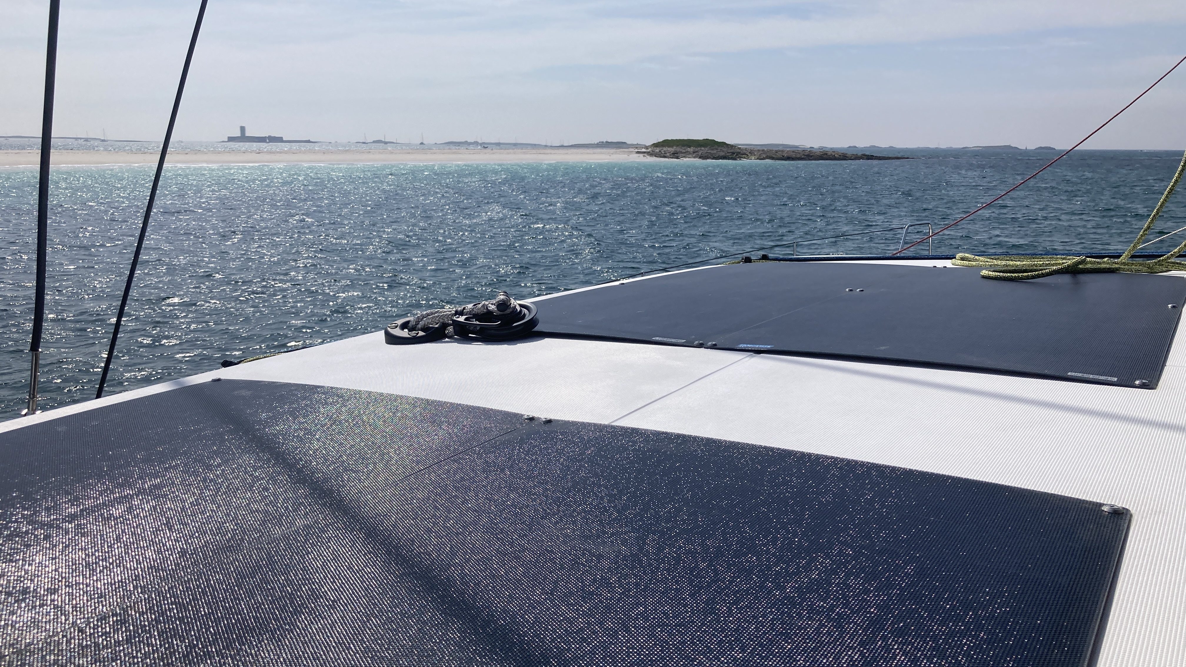 La source de production la plus simple car passive pour le bateau reste le panneau photovoltaïque. Les éoliennes viennent en complément pour permettre une continuité de production électrique la nuit et l’hivers. D’autres moyens innovants permettent de valoriser l’espace prit sur la mer, voir même servir la biodiversité.